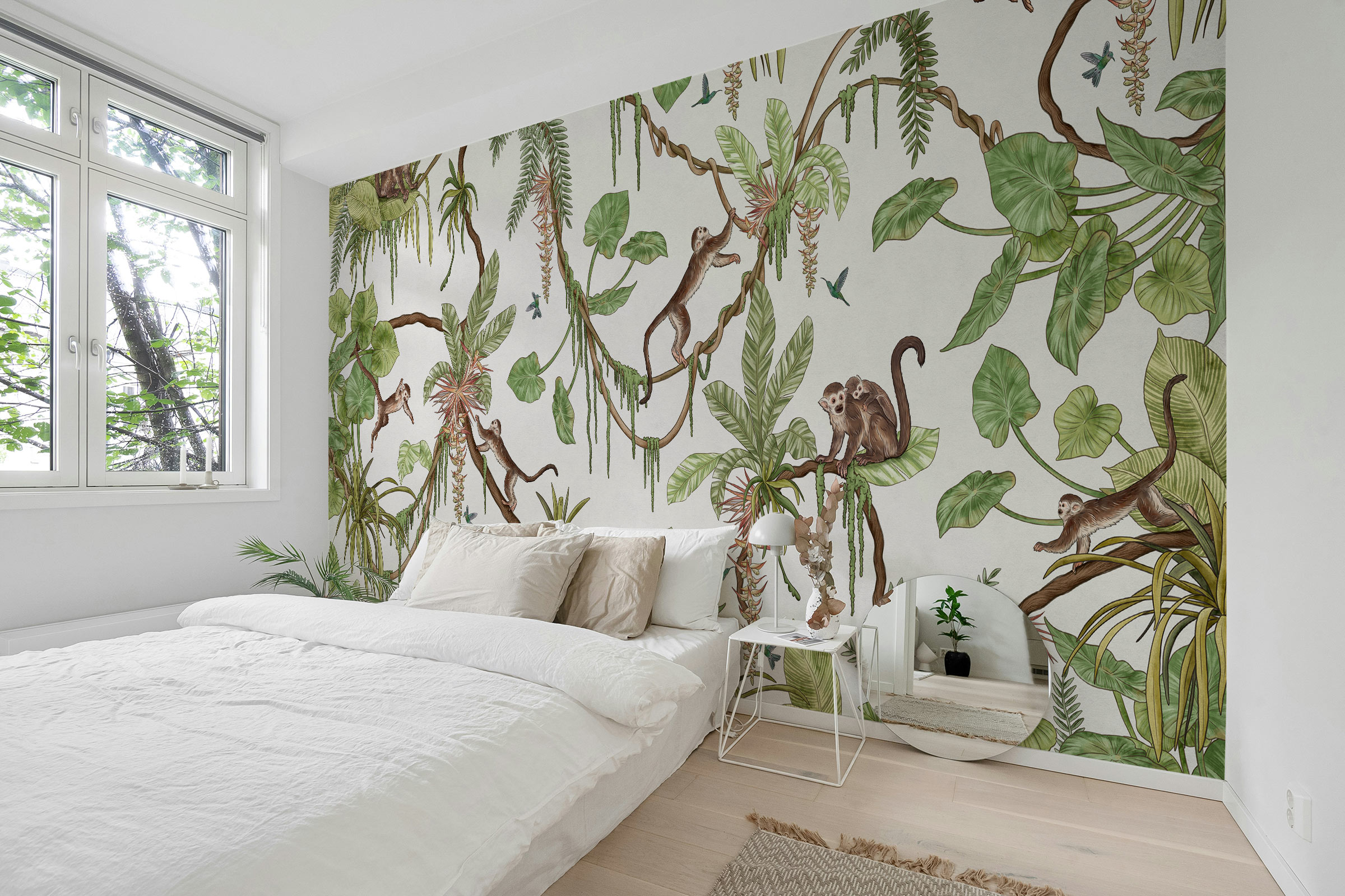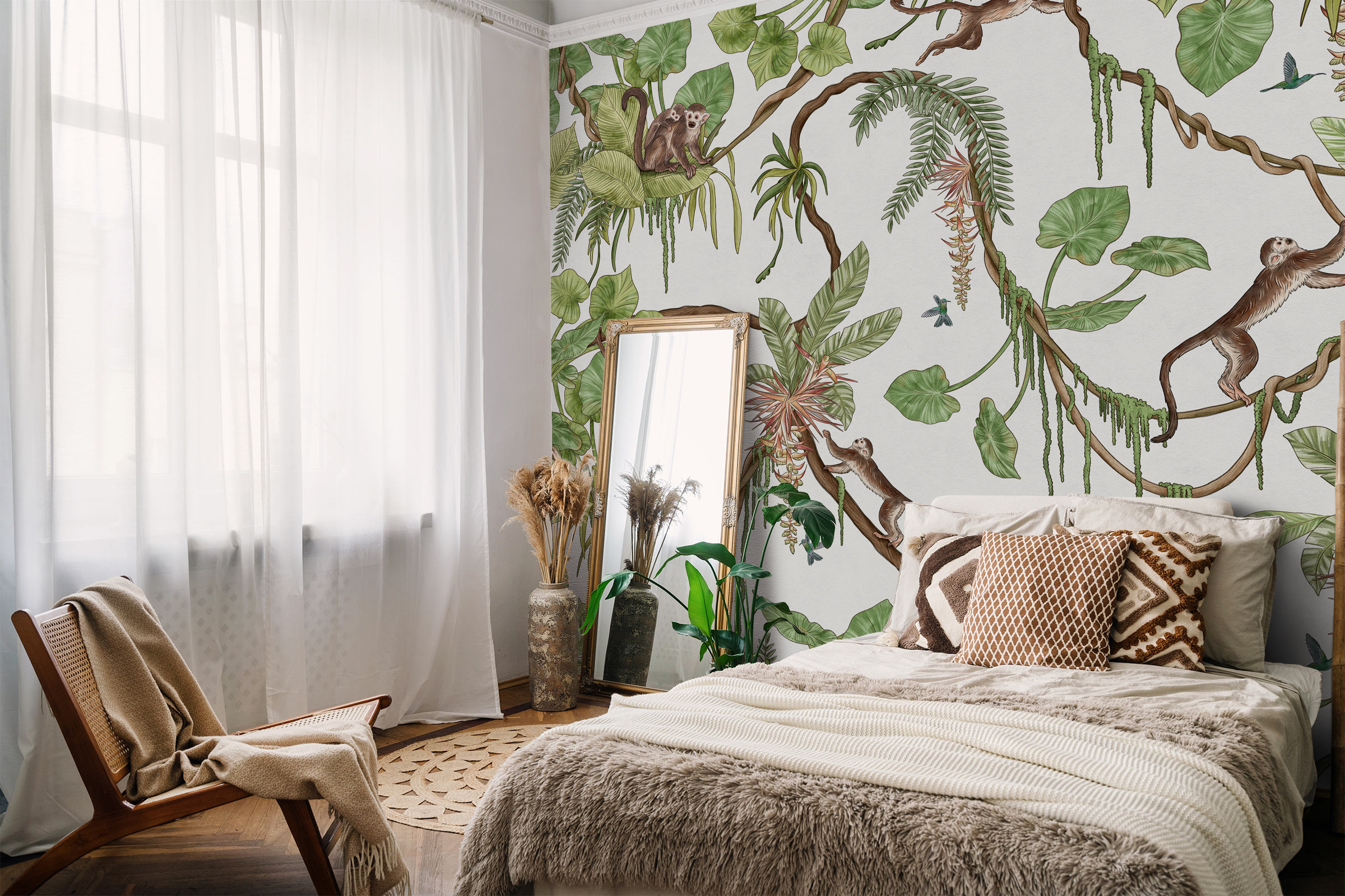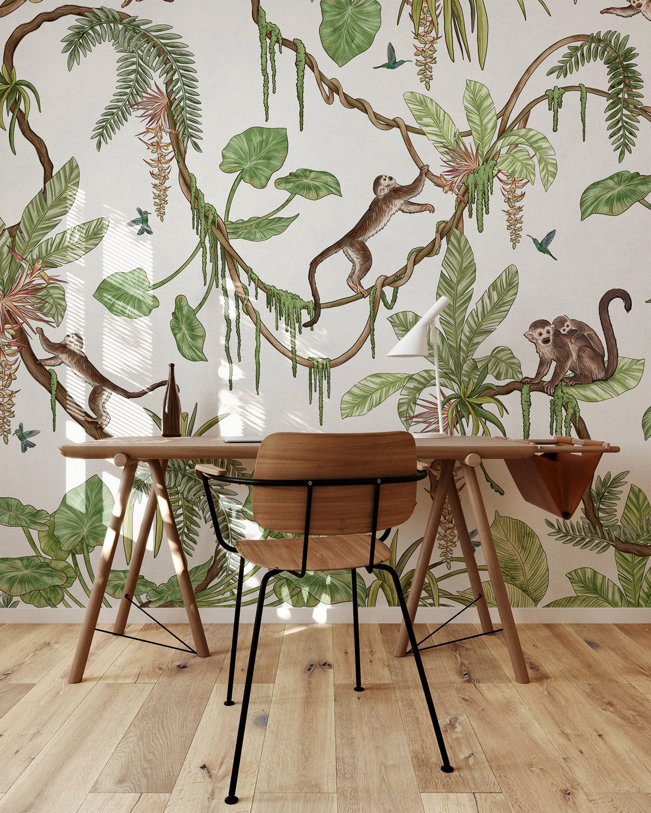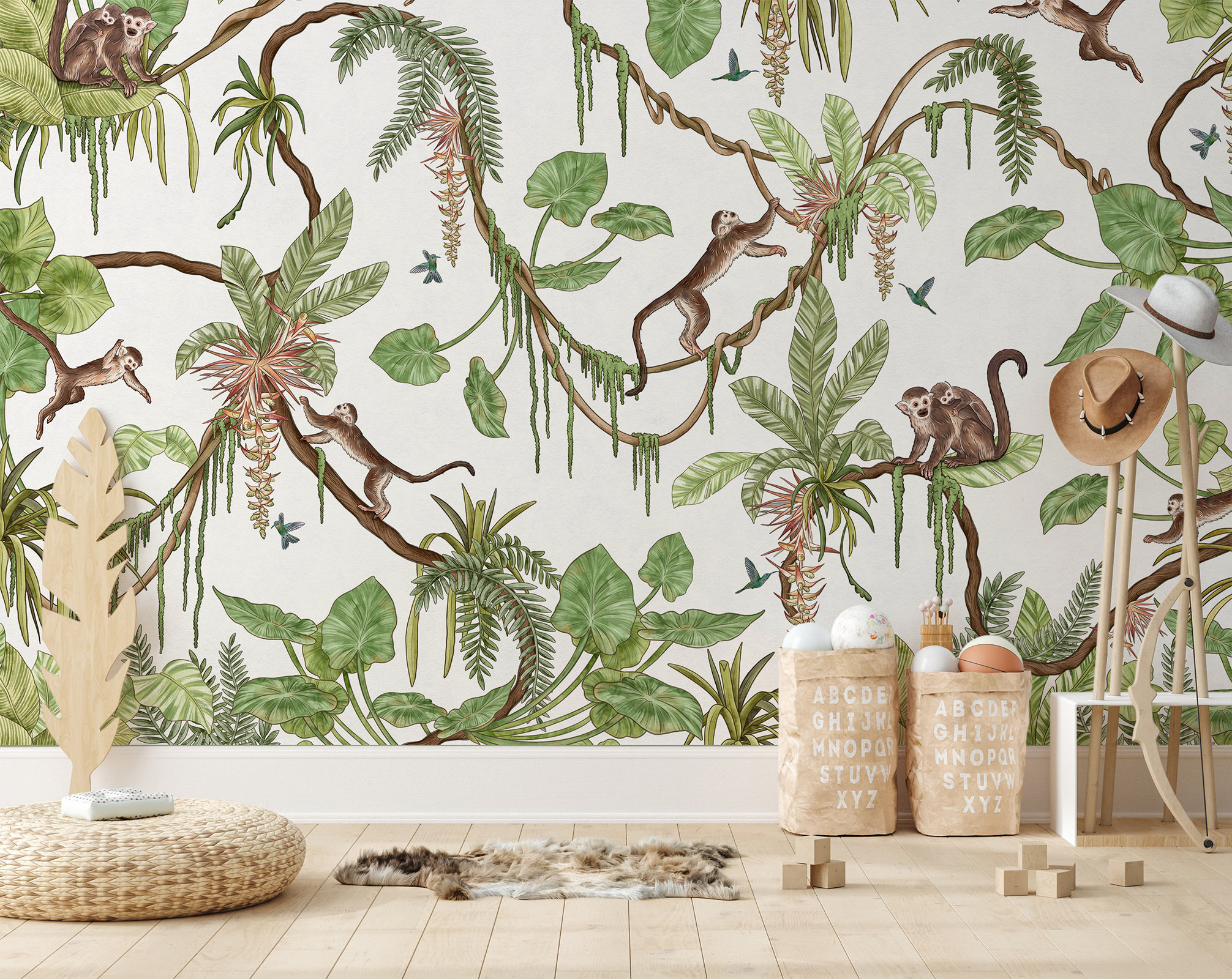 Troopiline tapeet ahikestega – see sobib veidi ulakasse interjööri! See on ahvidega pilttapeet, mis toob tuppa džungli salongi-versiooni. Veidi mänguline, aga selgelt täiskasvanulik. Valgel taustal liiguvad väikesed ahvid mööda liaane, ümberringi lopsakad lehed ja troopilised taimed. Joonistatud detailid annavad seintele illustratsioonilikult elegantse ilme, nagu oleksid tellinud kunstiteose otse oma elutuppa. Tulemuseks on jungle chic sein, millel pilk jääb puhkama – olgu see siis lastetuba või iseenda magamistuba.