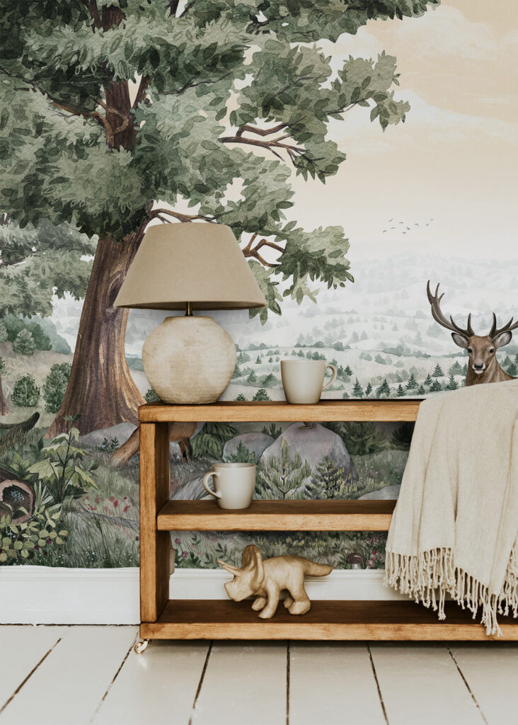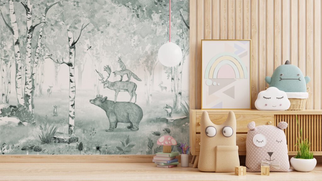 In a baby’s room it’s tempting to go for very sweet, playful patterns, but those get old fast. Calm wall murals with soft landscapes, forests or gently illustrated animals work much better. They create a feeling of space and calm, and they still look right when the crib turns into a real bed.