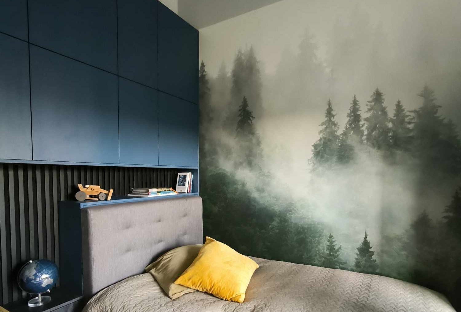 When he reaches school age, the room starts to feel more like his own territory. This is where slightly deeper colours, city views, forests, mountains or graphic patterns really shine. They don’t feel childish, but they’re still full of character. A well-chosen wall mural gives the room personality without making it visually busy.