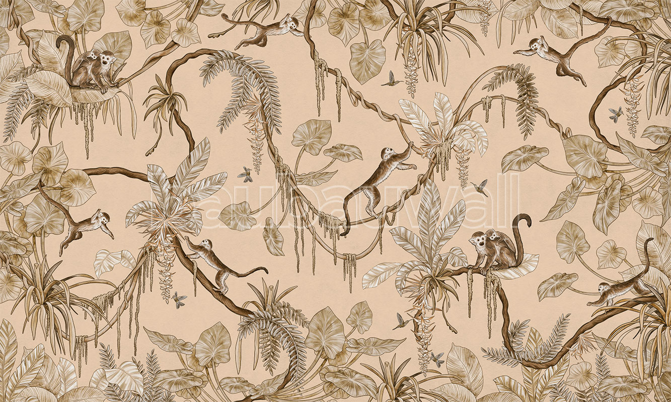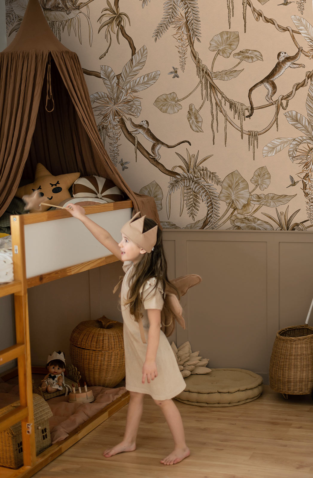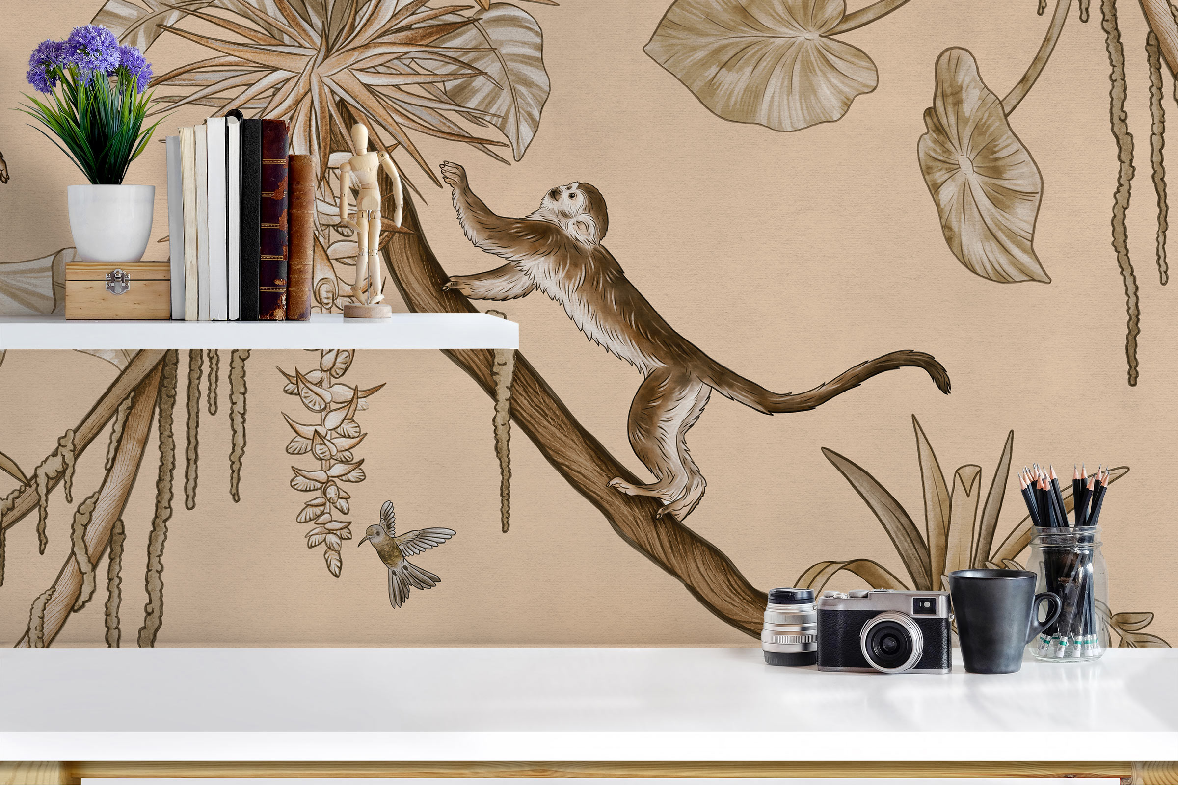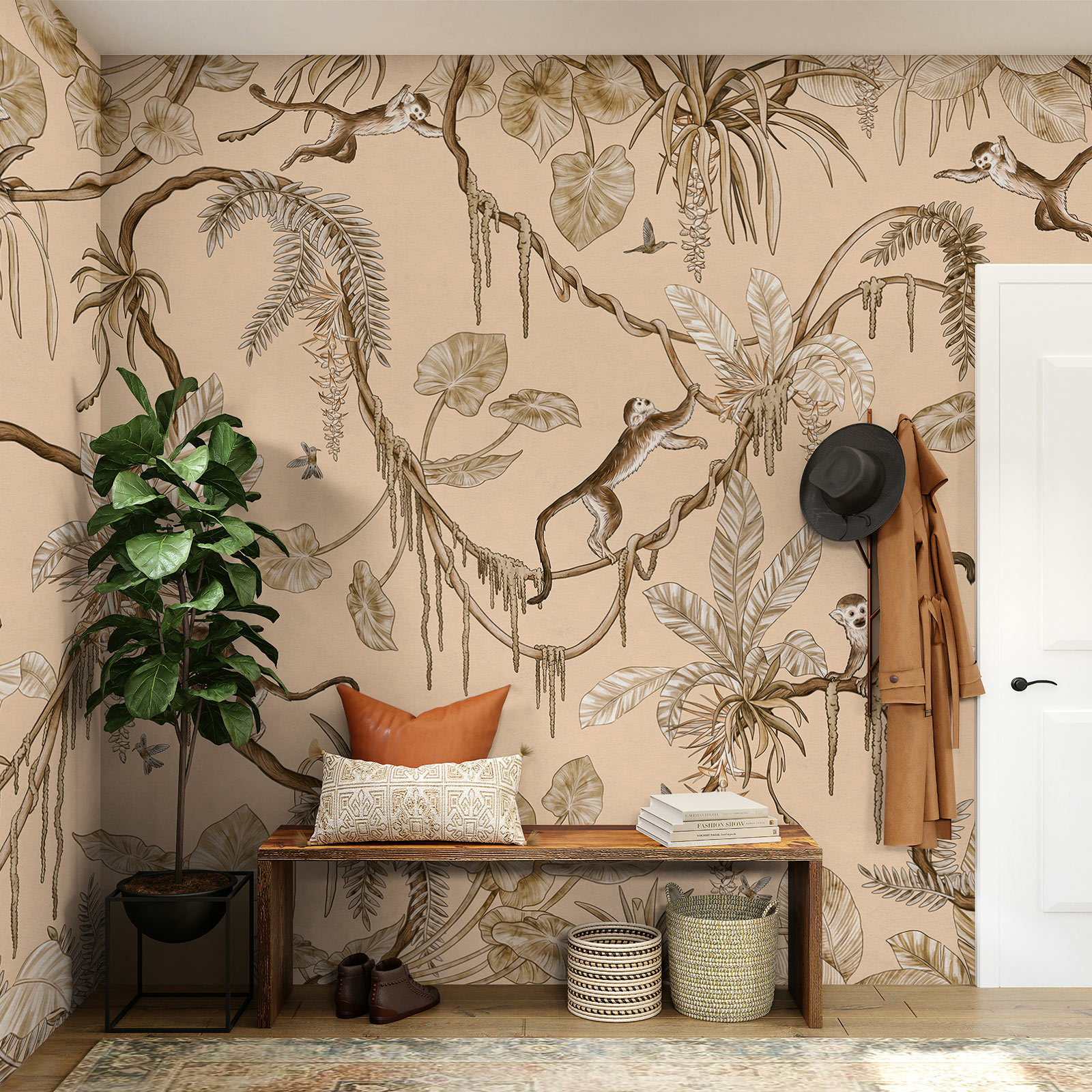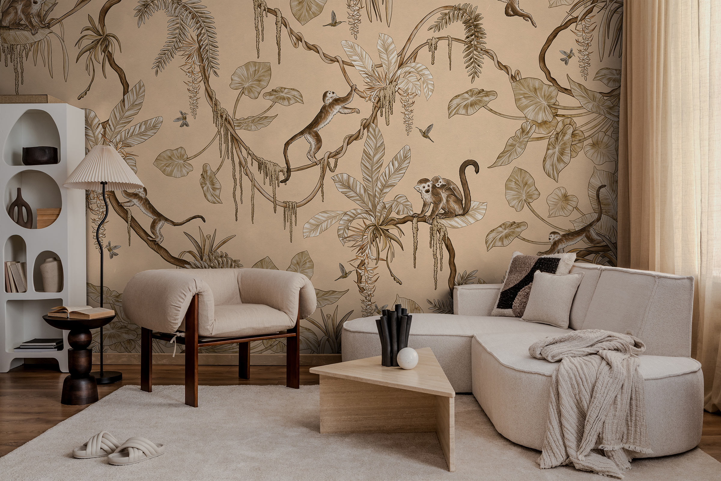Jungle chic mural wallpaper at its best! Turn the headboard wall into the star of the room. This tropical, beige mural wallpaper layers hand-drawn foliage, swinging monkeys and climbing vines, creating the kind of jungle chic mood you usually only find in a boutique hotel. By day it feels lush and exotic, by evening the wam beige wraps the hotel room in a cosy, cocoon-like glow.