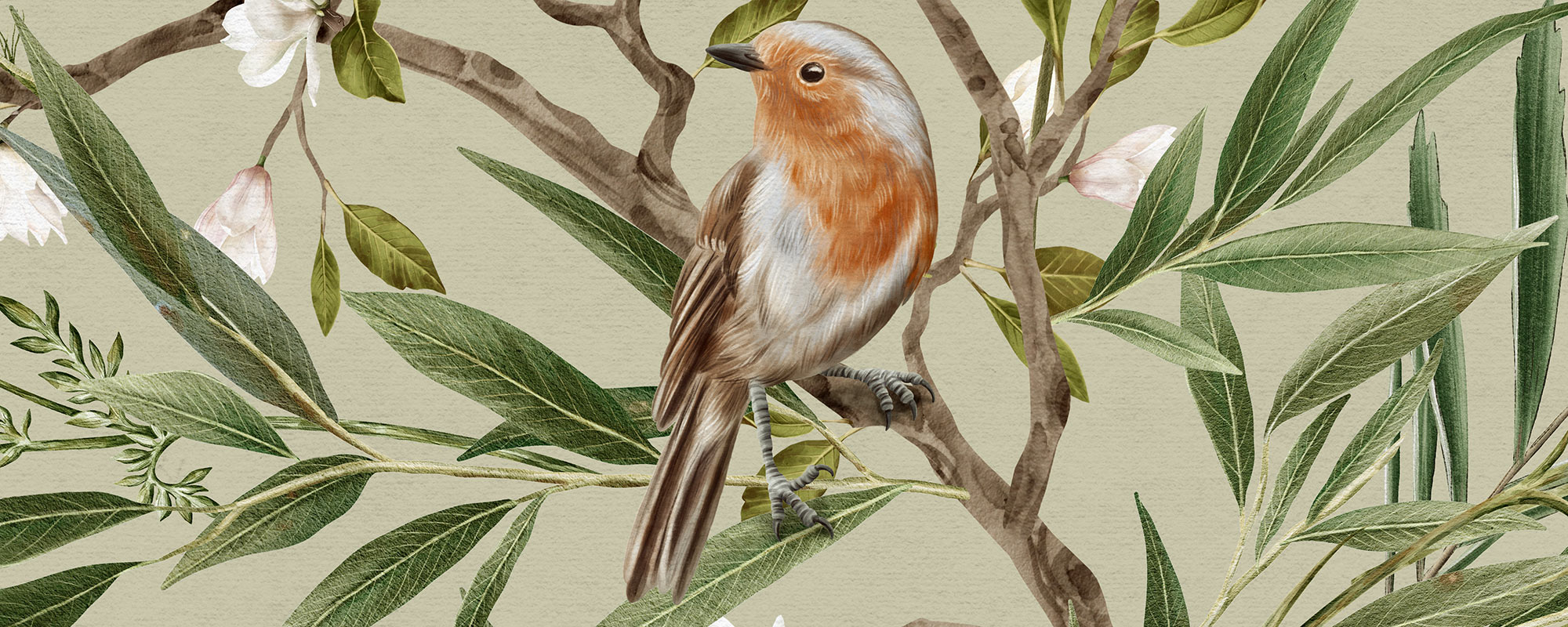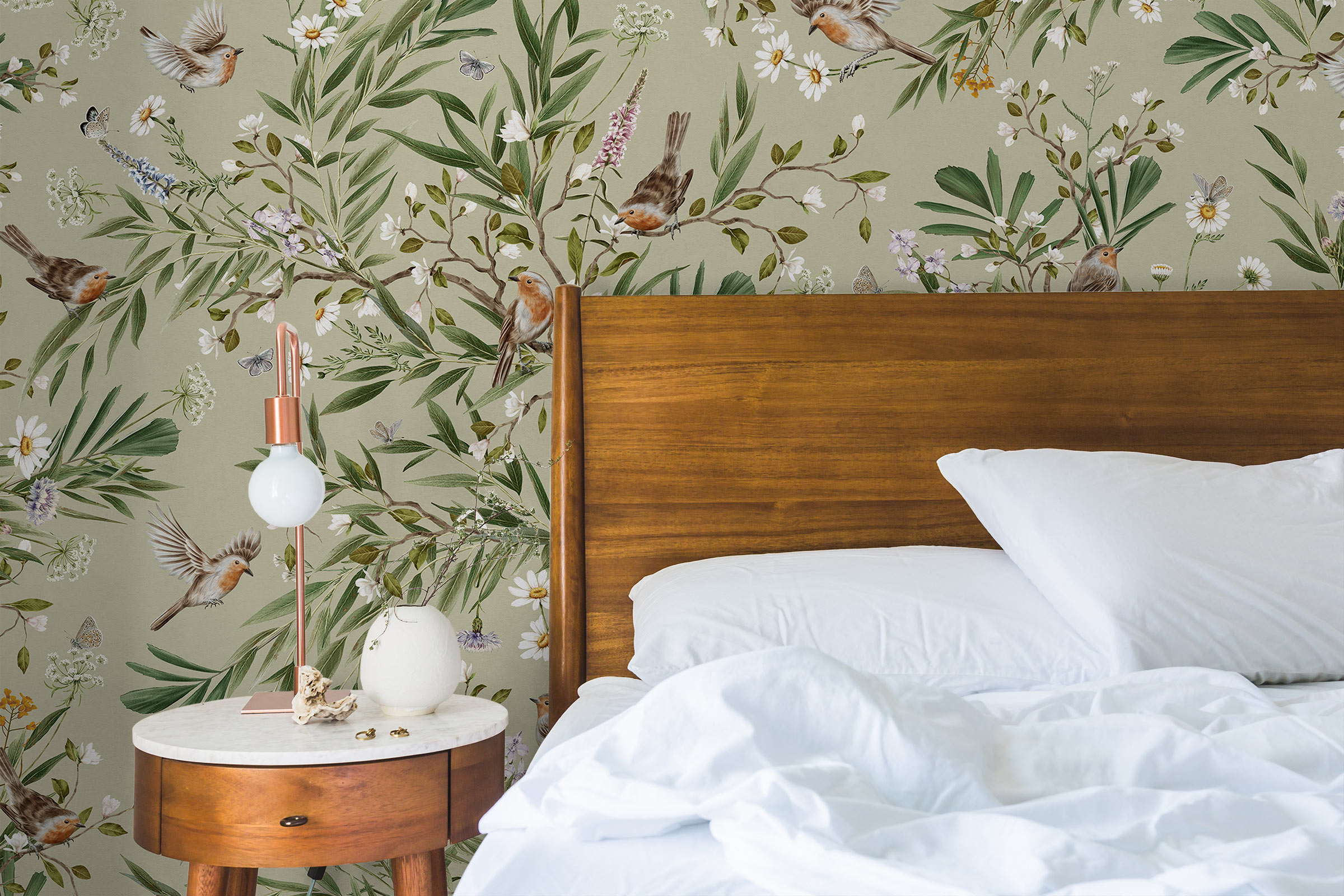 Robins bird wallpaper is a timeless choice for your walls. Afterall, there’s something soothing about a wall filled with soft branches, fluttering robins, and blooming wildflowers. Robins & Blossoms in soft green brings that calm garden moment indoors — a gentle scene of nature’s everyday beauty.