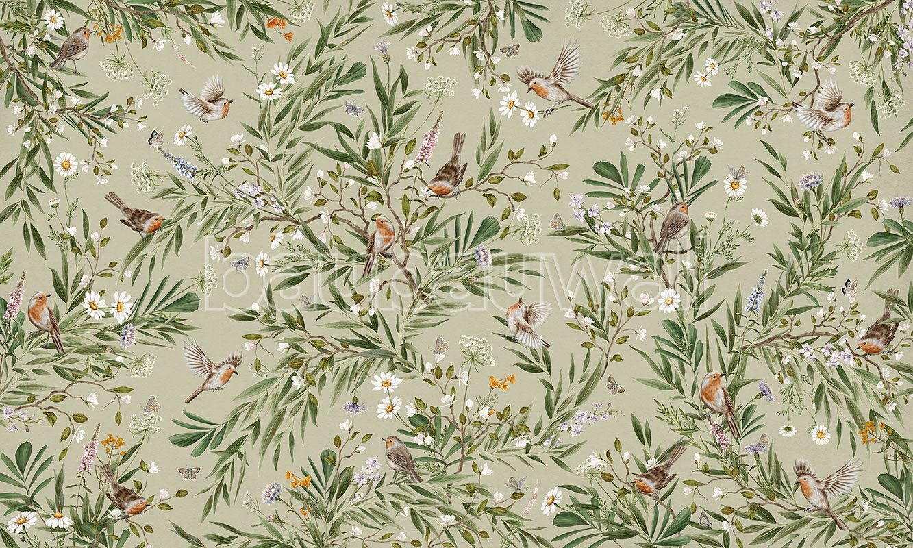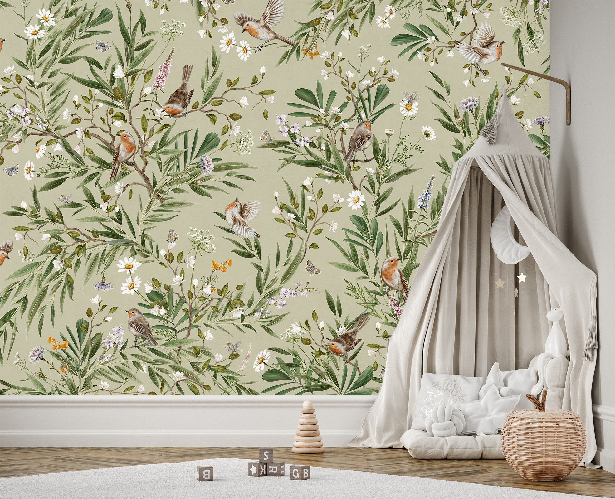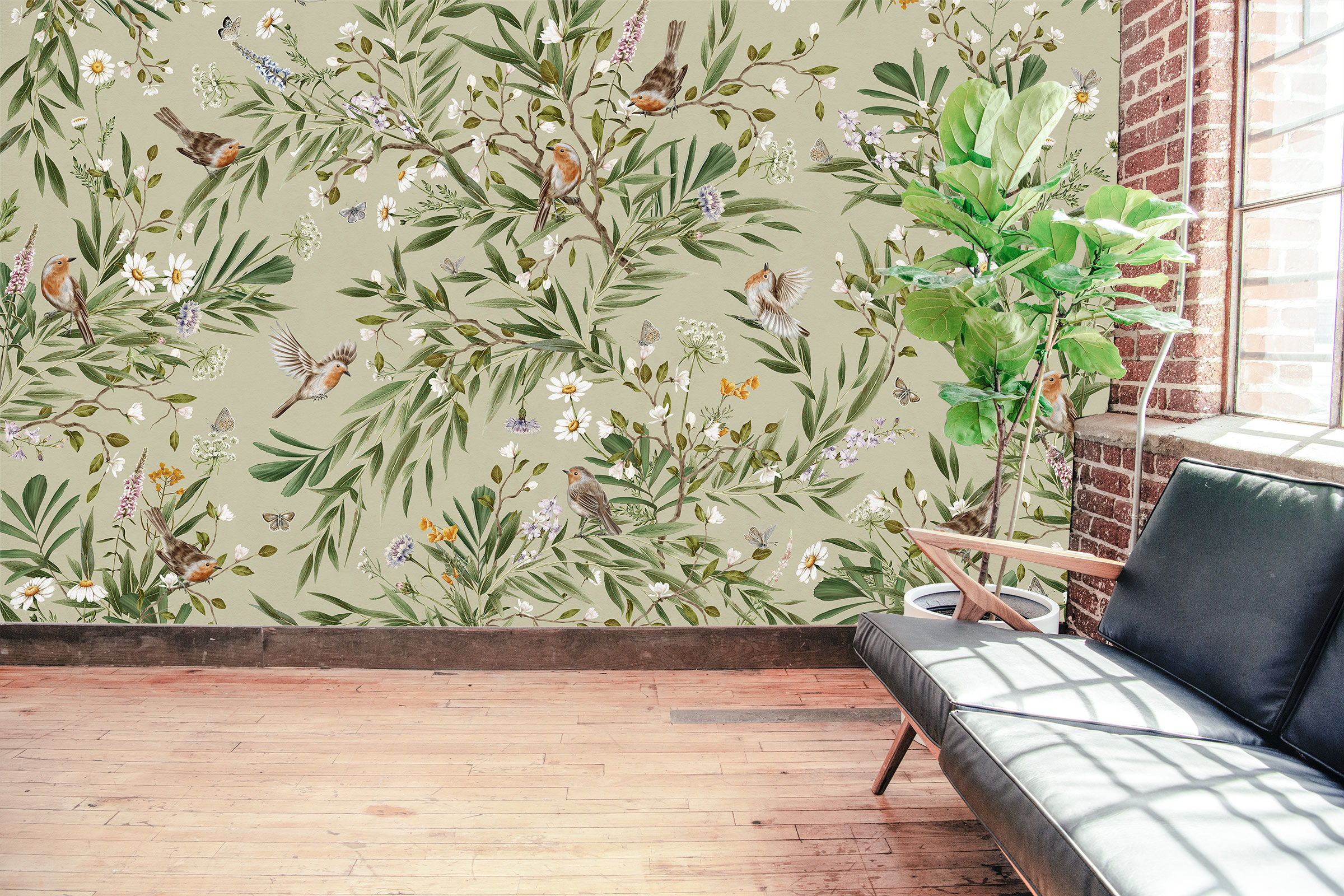 This robins bird wallpaper pairs warm neutral tones with delicate greens and touches of orange from the birds’ feathers. The result is a mural that feels alive yet peaceful, perfect for bedrooms, living rooms, or reading corners.