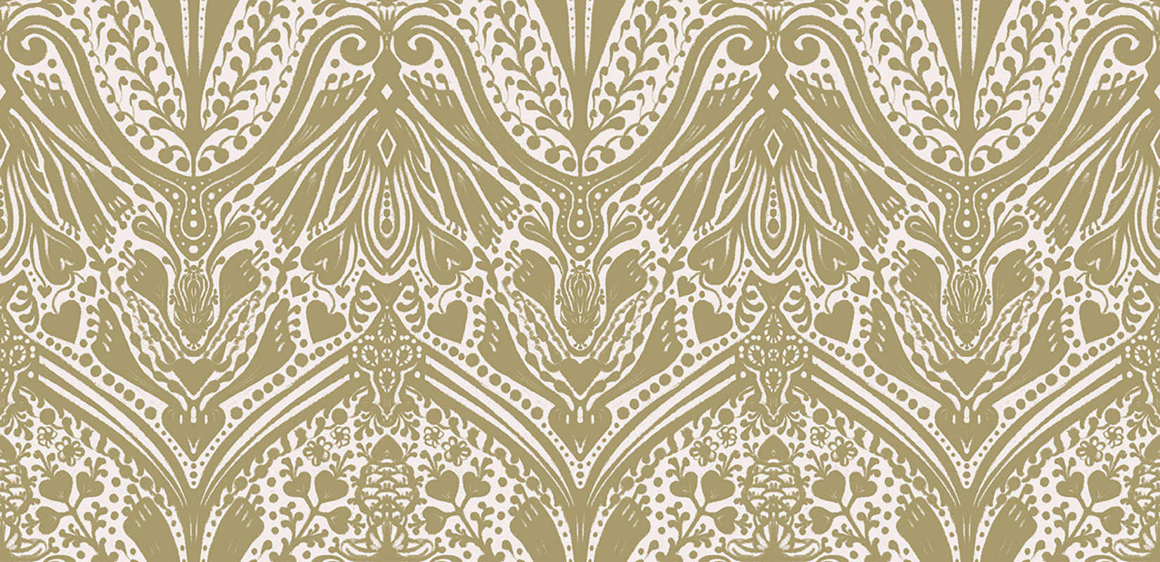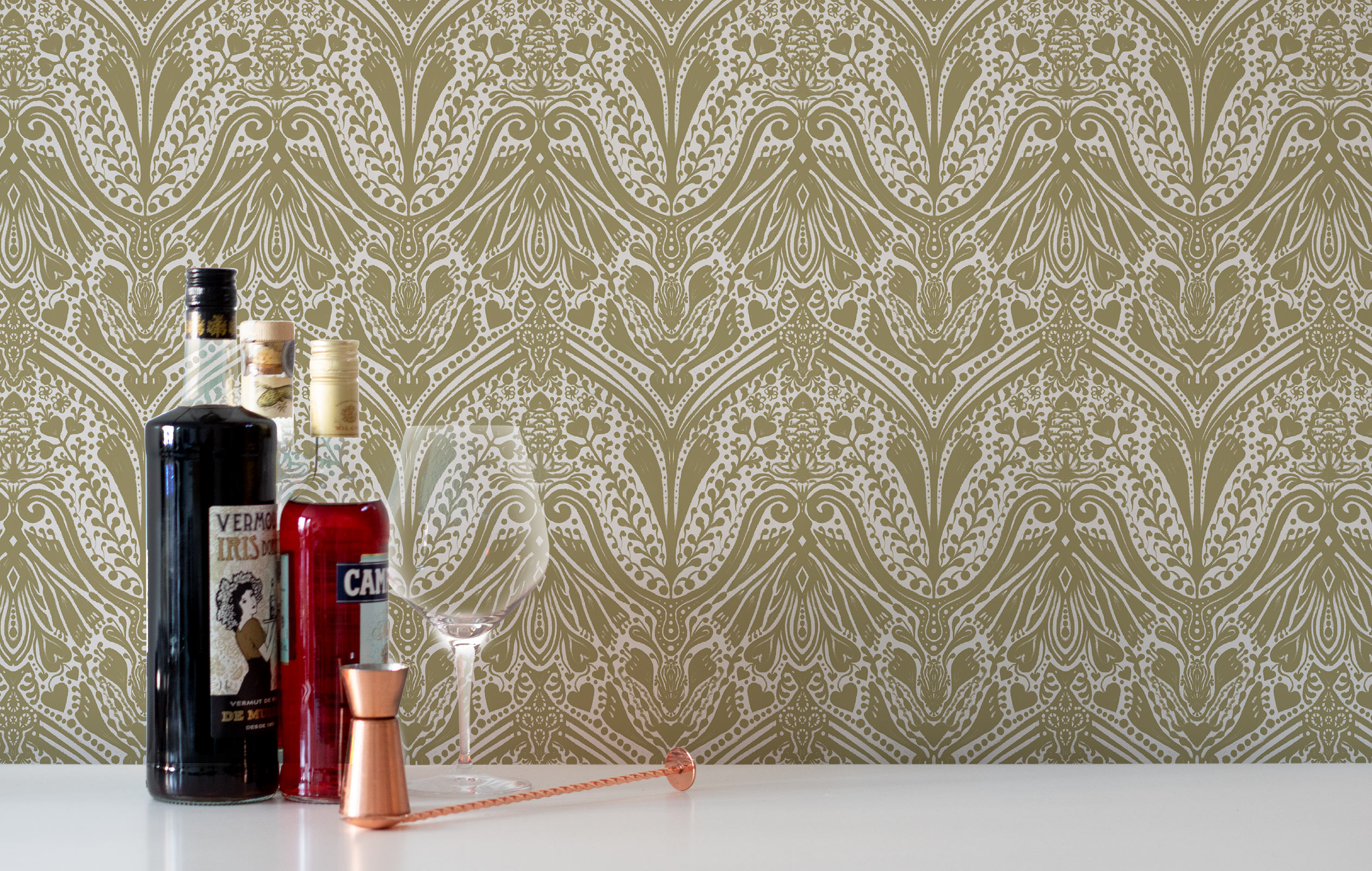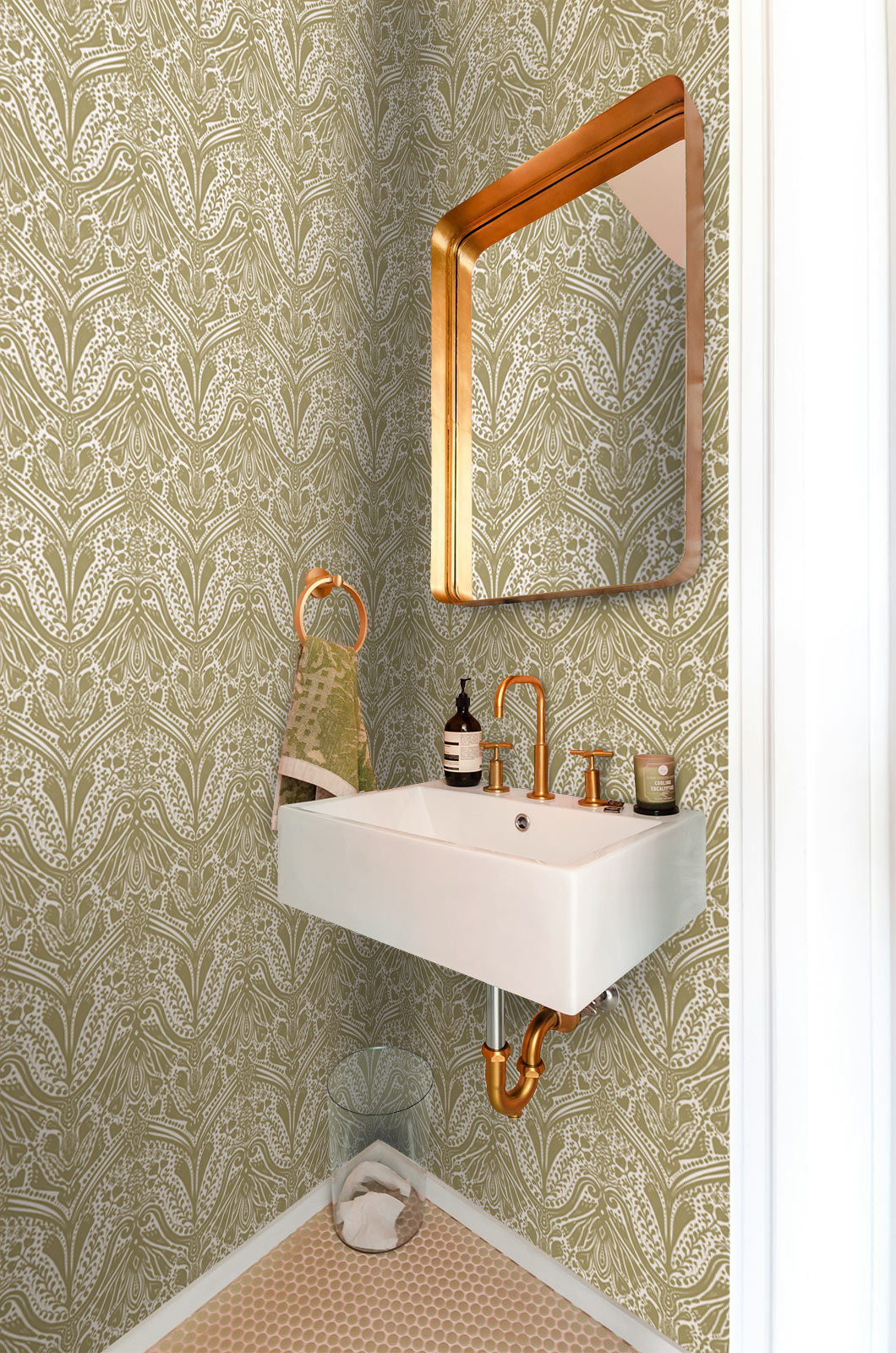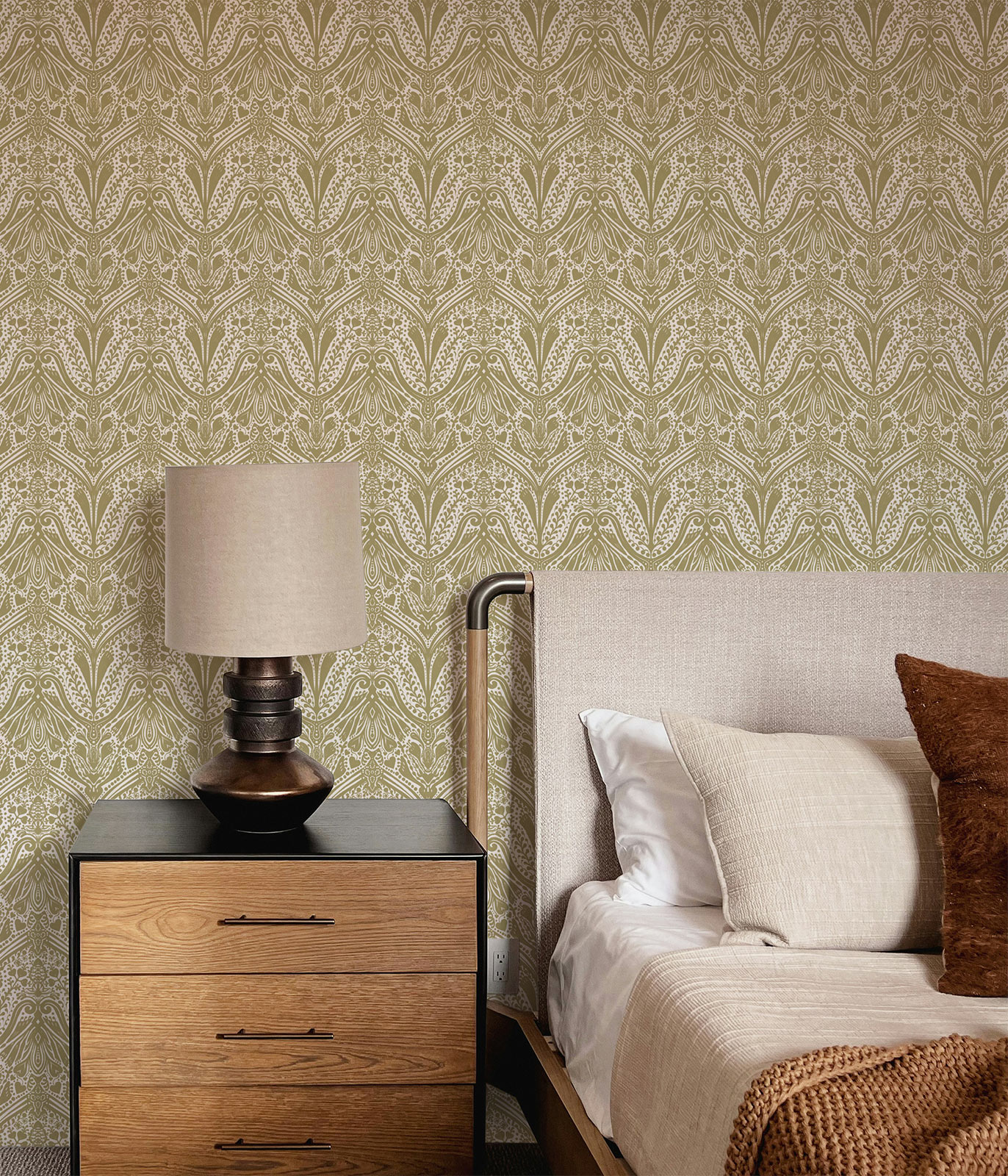 Ballroom Brocade in beige is refined, yet approachable wallpaper. The design takes the richness of vintage wallpaper and translates it into soft beige tones with an olive undertone. The look is elegant, timeless, and surprisingly easy to pair with modern furniture.