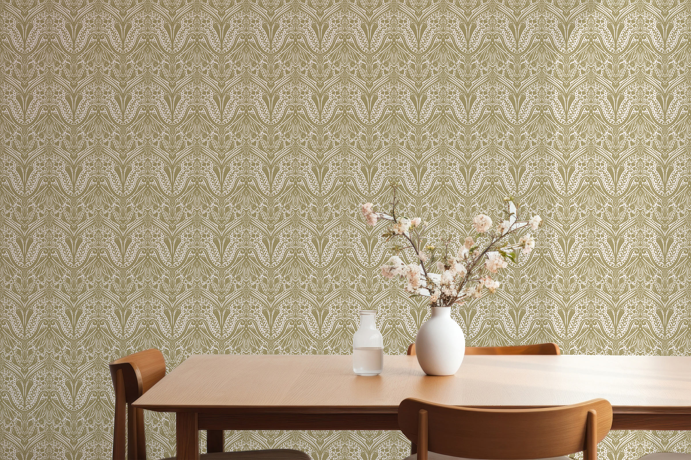 The brocade motif flows in gentle curves, adding rhythm and detail to the wall. Because the colors are muted, the pattern feels balanced rather than overpowering. This makes it ideal for dining areas, bedrooms, or even a calm home office.