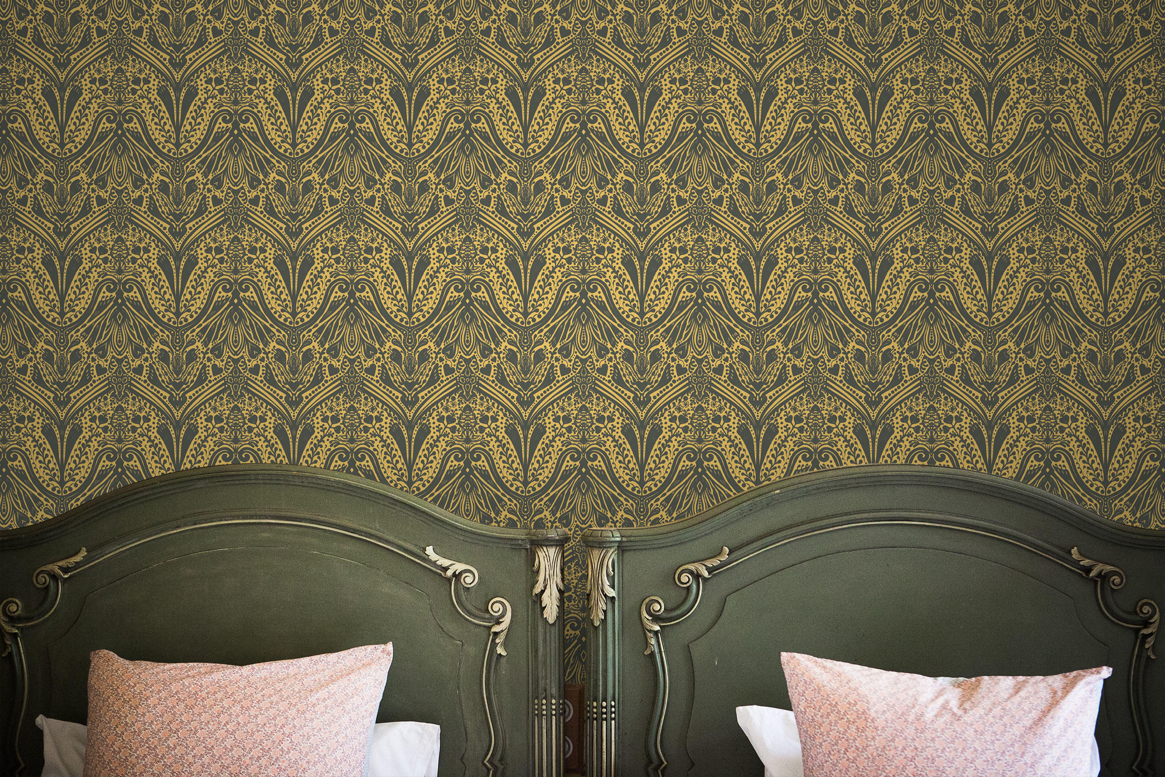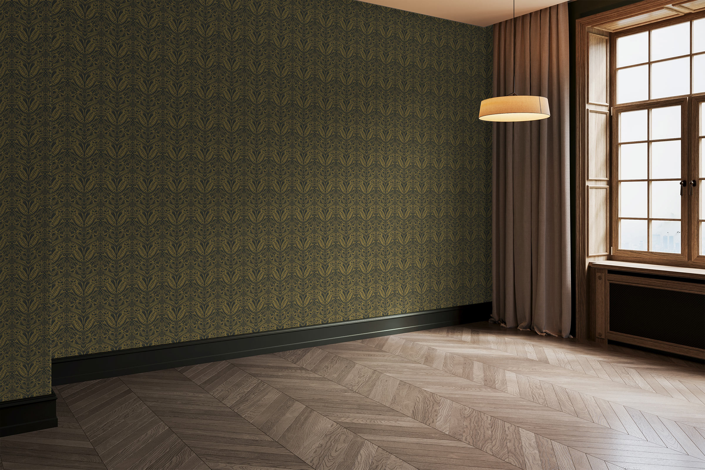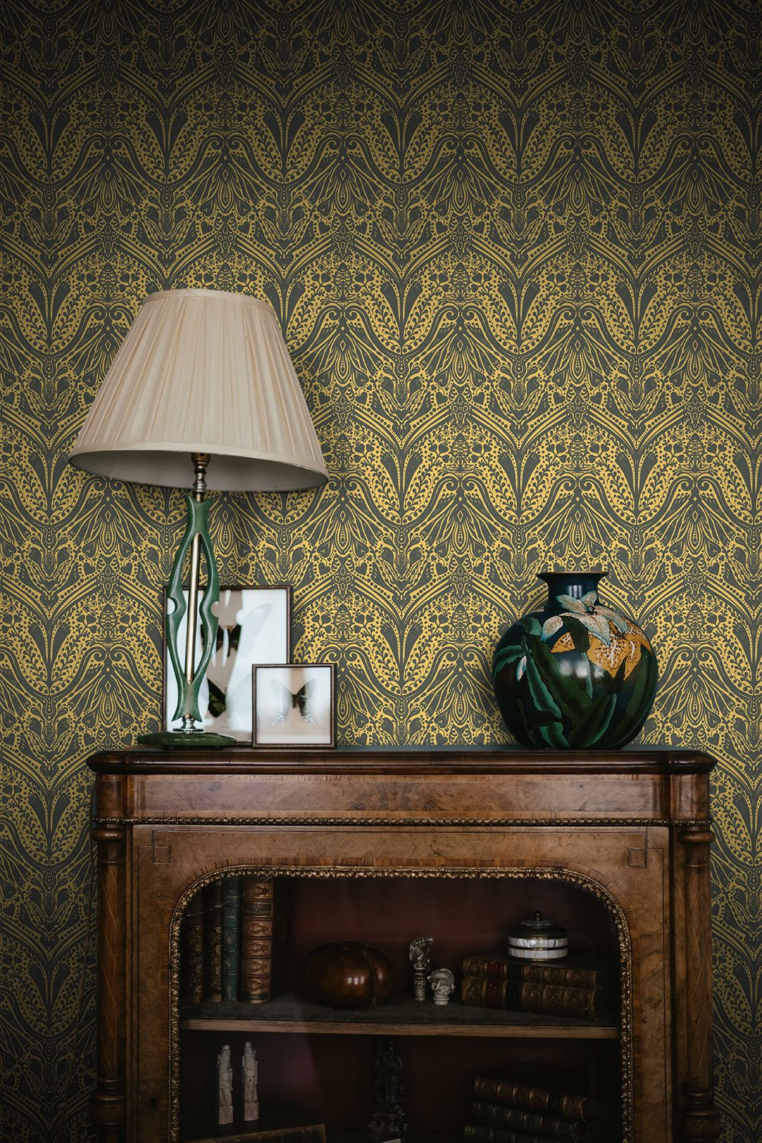The ornate detailing brings movement and depth, while the mustard yellow tones keep it warm and dramatic. Because of this balance, the wallpaper works beautifully in bedrooms, dining rooms, or any space where you want a sense of luxury.