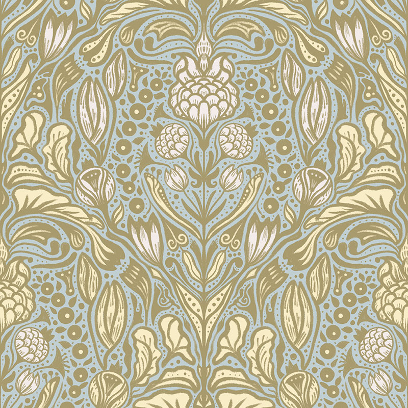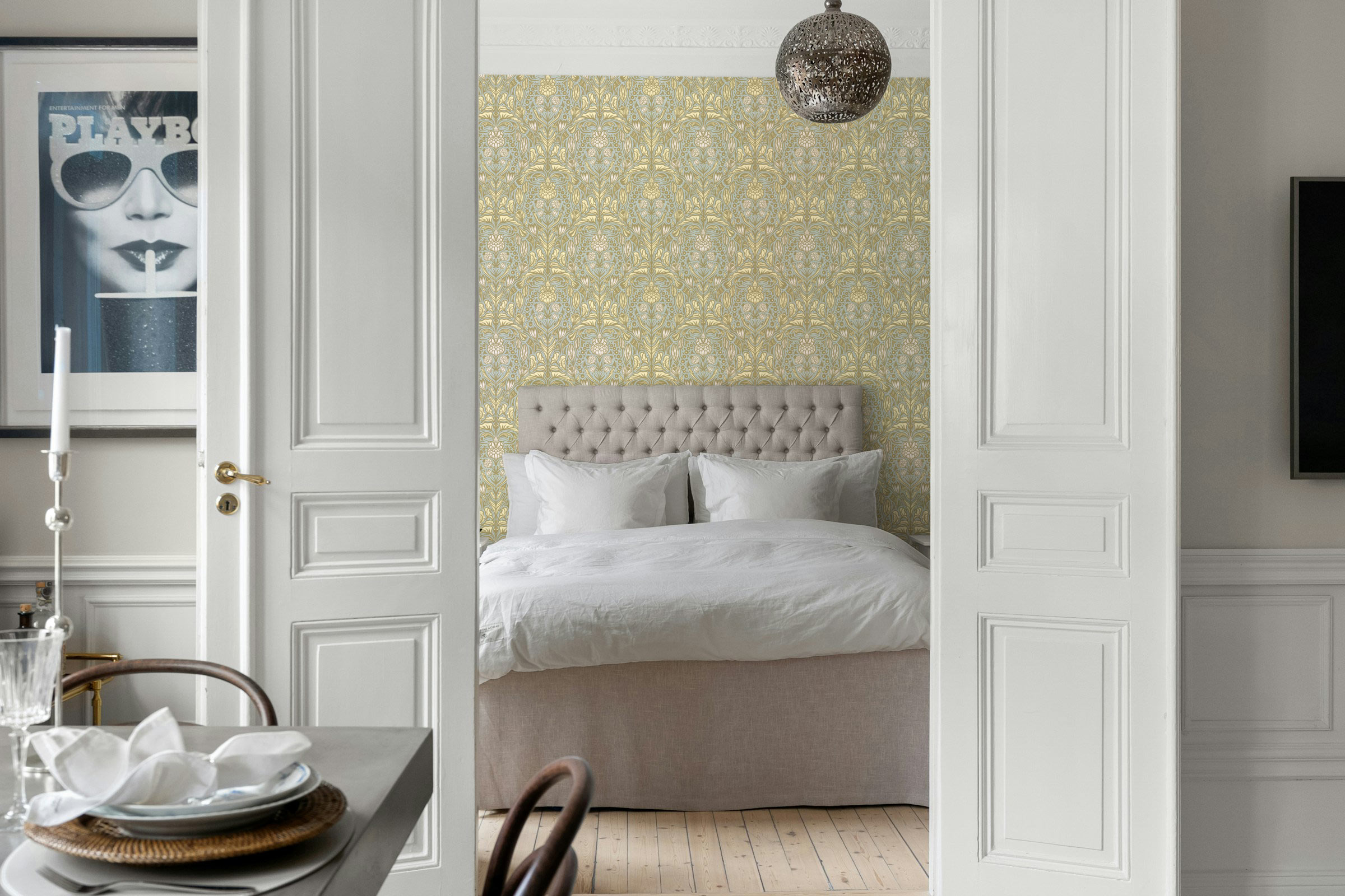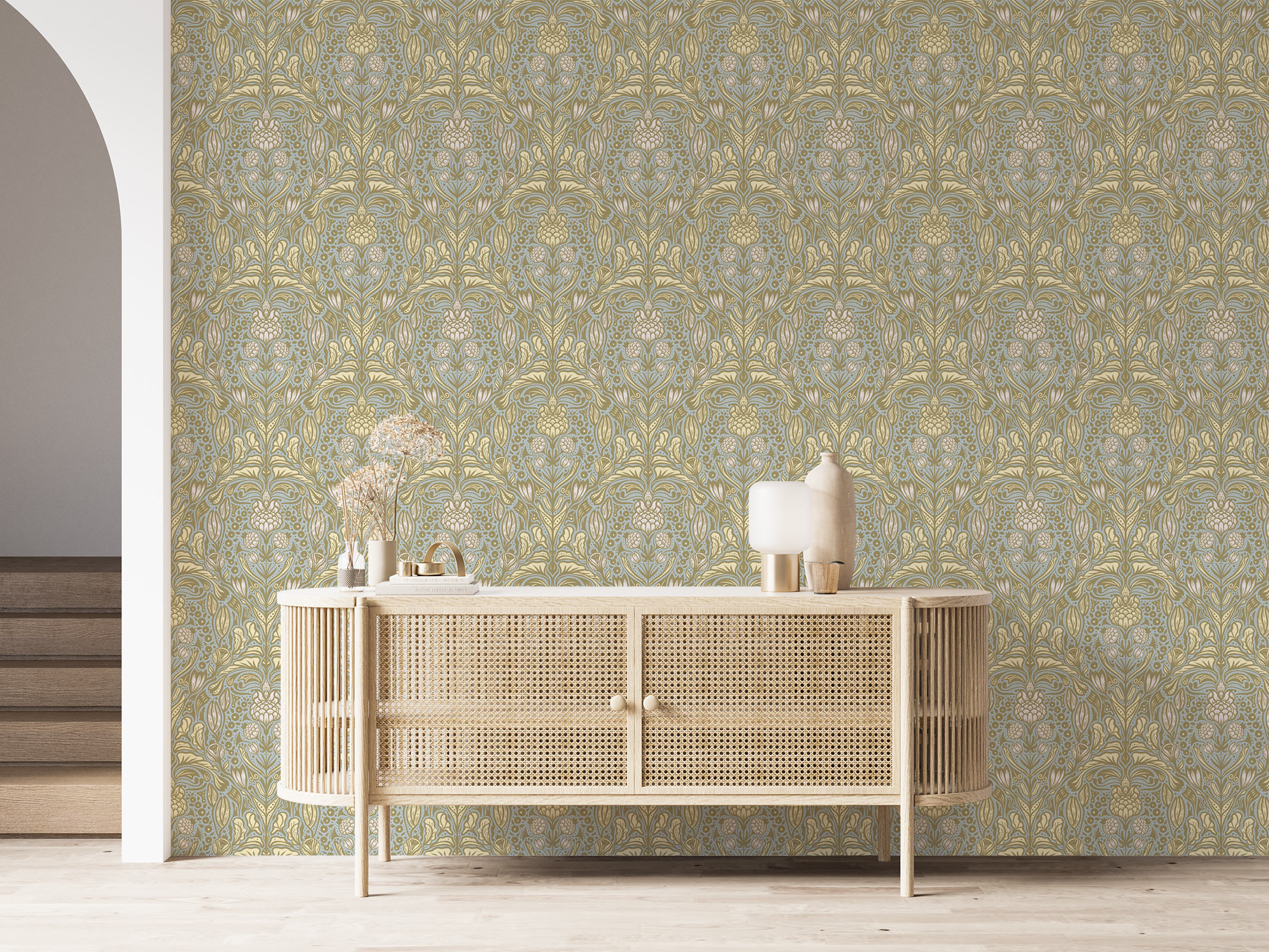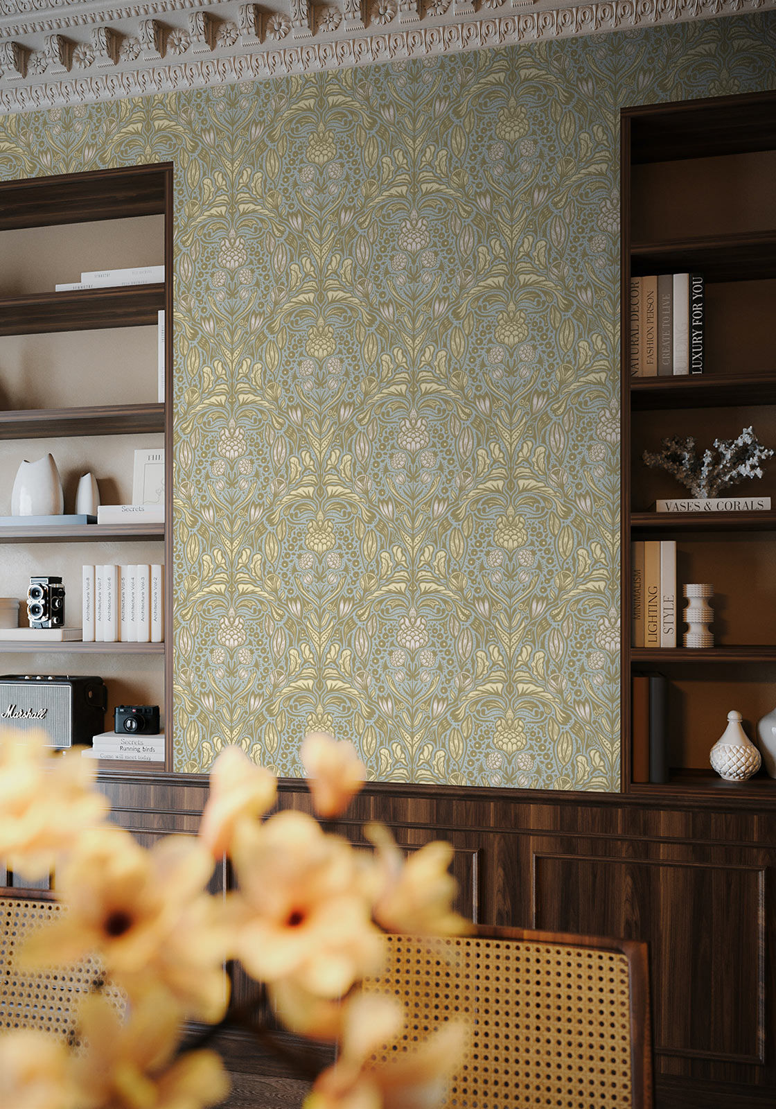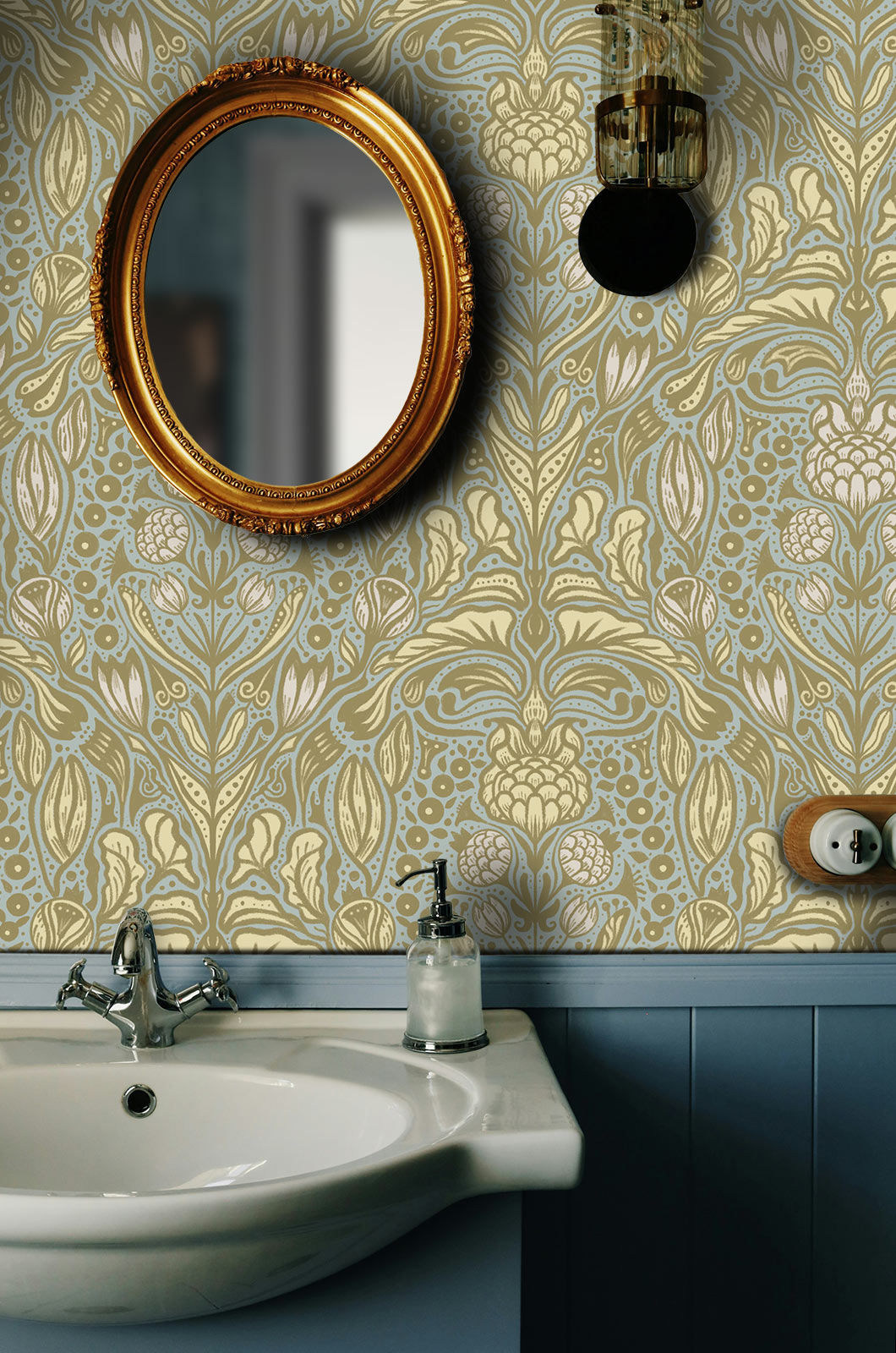 There’s something quietly majestic about traditional wall wallpaper done well. Queen’s Parterre in Duck Egg Blue is proof of that. With its ornate patterning, inspired by the sculpted symmetry of historic palace gardens, this wallpaper brings a sense of order and elegance to the room. The soft duck egg blue base is calming yet distinguished, while the golden floral motifs add warmth and depth. Together they strike a balance between heritage charm and modern usability – a design that feels timeless, not old-fashioned.