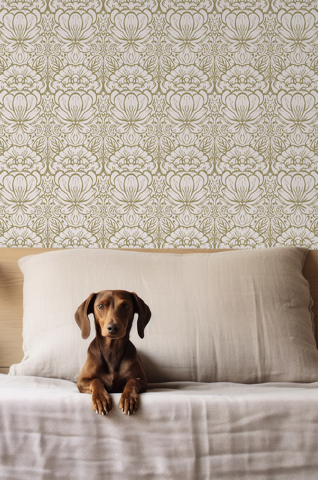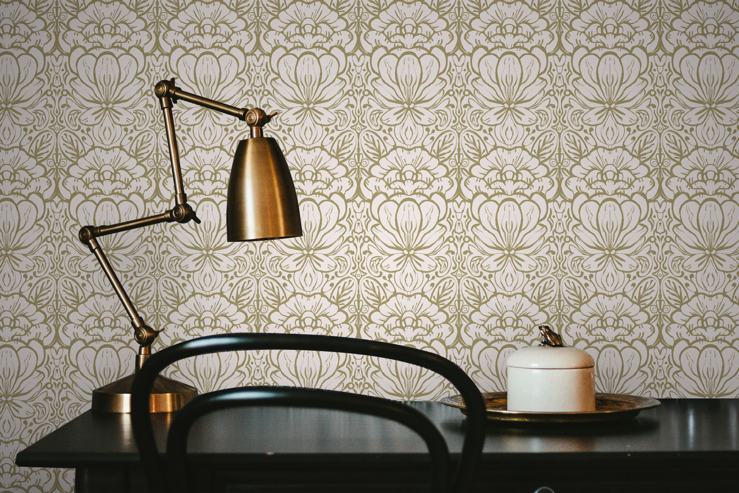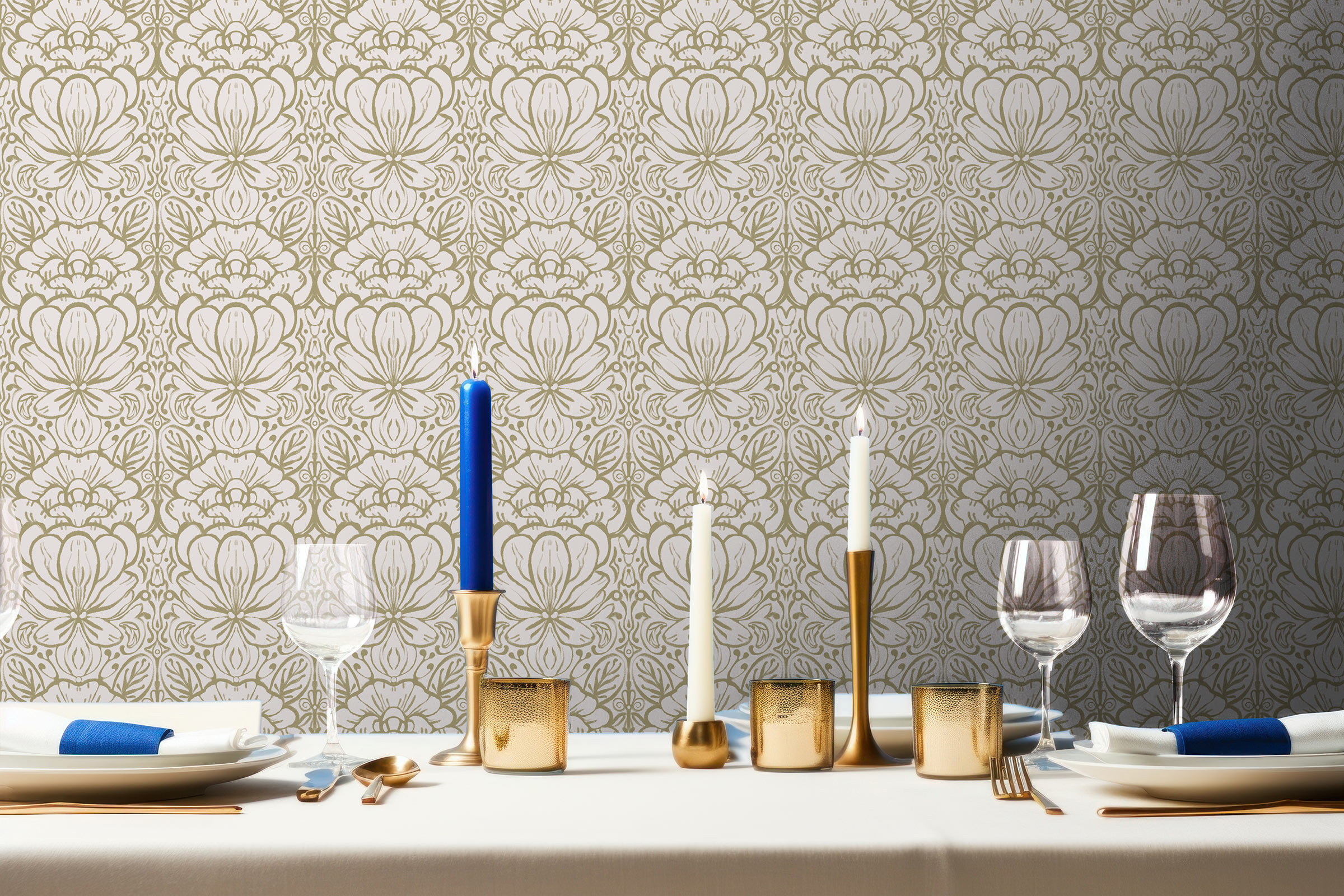 If timeless elegance had a color, it might just be beige. Salon Damask in beige takes the ornamental richness of traditional damask wallpaper and softens it into a palette that feels calm, warm, and versatile. The large-scale floral damask motif unfolds across the wall like a woven tapestry, its beige lines catching the light and adding quiet depth. It’s a design that pairs beautifully with neutrals, yet also makes a graceful backdrop for bolder accents — from midnight blue candles to brass tableware. Alongside to endless dinner parties with your loved ones! A design that lets you create a salon of your own, one dinner party or quiet evening at a time. Beige wallpaper brings balance: decorative but not overwhelming, classic but never outdated