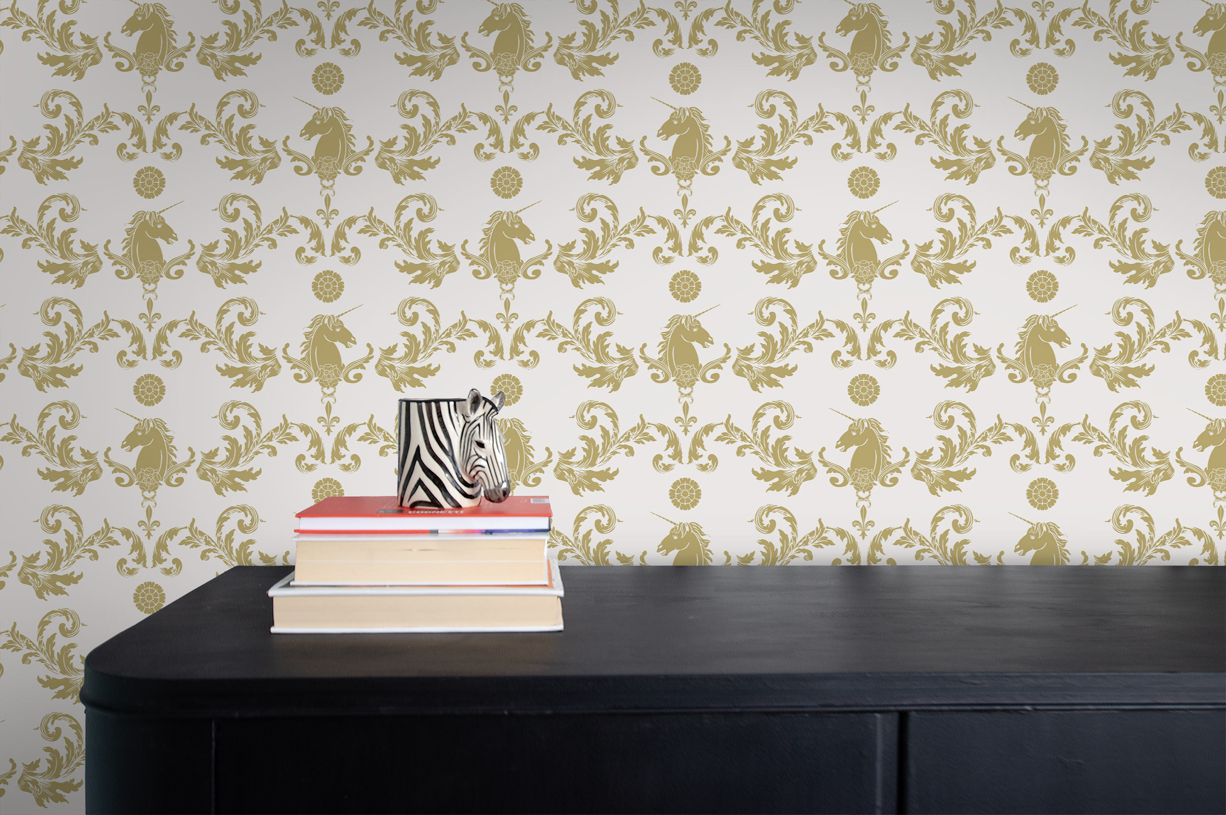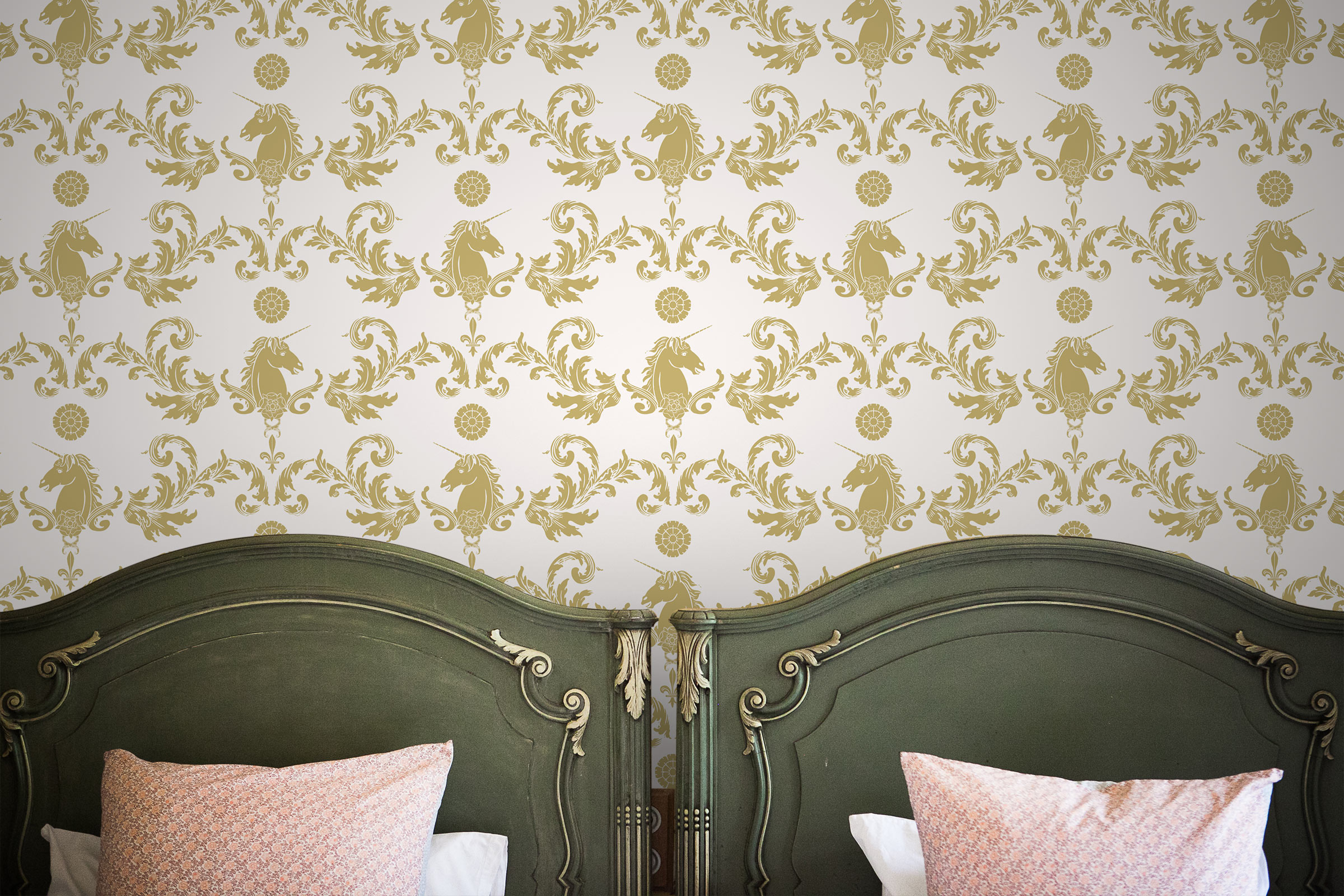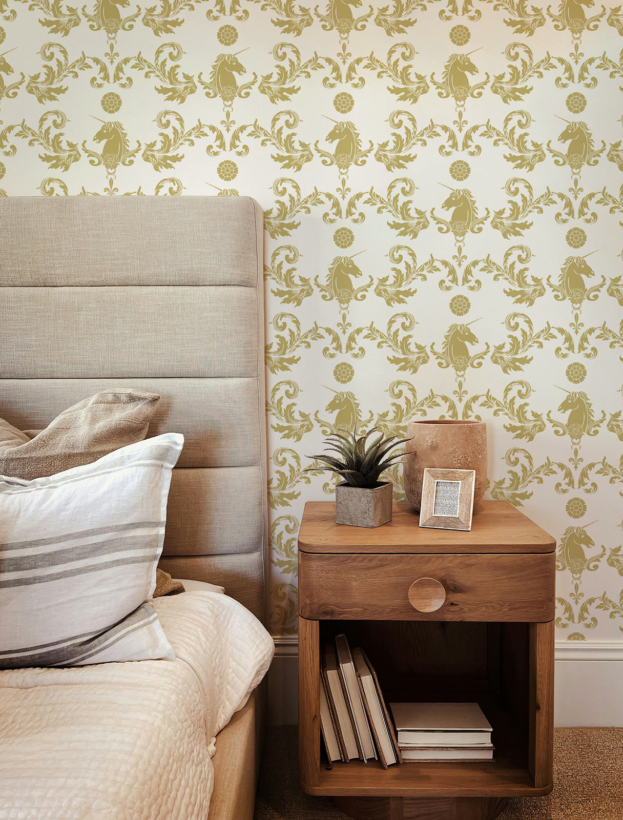 A cream beige unicorn wallpaper for a wall that feels like a fairy-tale. Unicorn Parade brings a playful twist to traditional damask patterns – instead of flowers alone, it hides proud unicorns among the flourishes. The result is both whimsical and elegant, a wallpaper that sparks imagination without losing its sense of style.