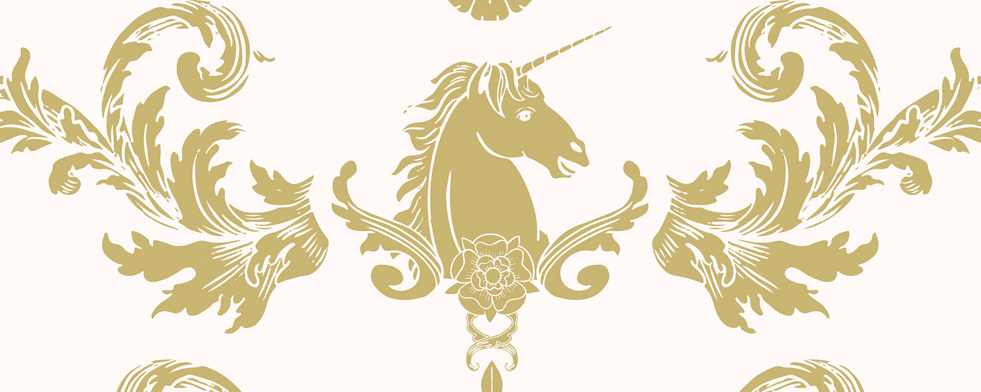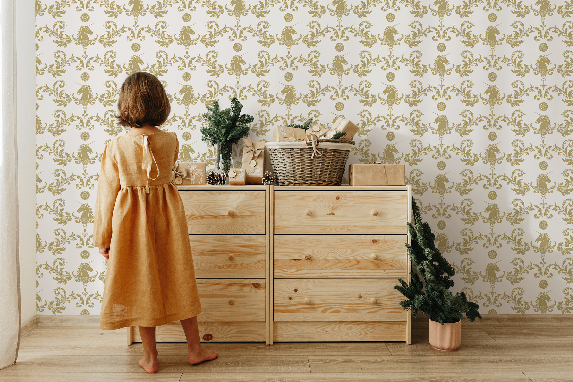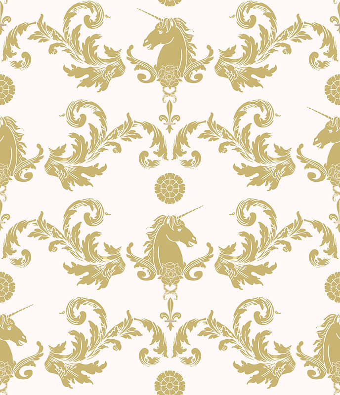 A cream beige unicorn wallpaper for a wall that feels like a fairy-tale. Unicorn Parade brings a playful twist to traditional damask patterns – instead of flowers alone, it hides proud unicorns among the flourishes. The result is both whimsical and elegant, a wallpaper that sparks imagination without losing its sense of style.