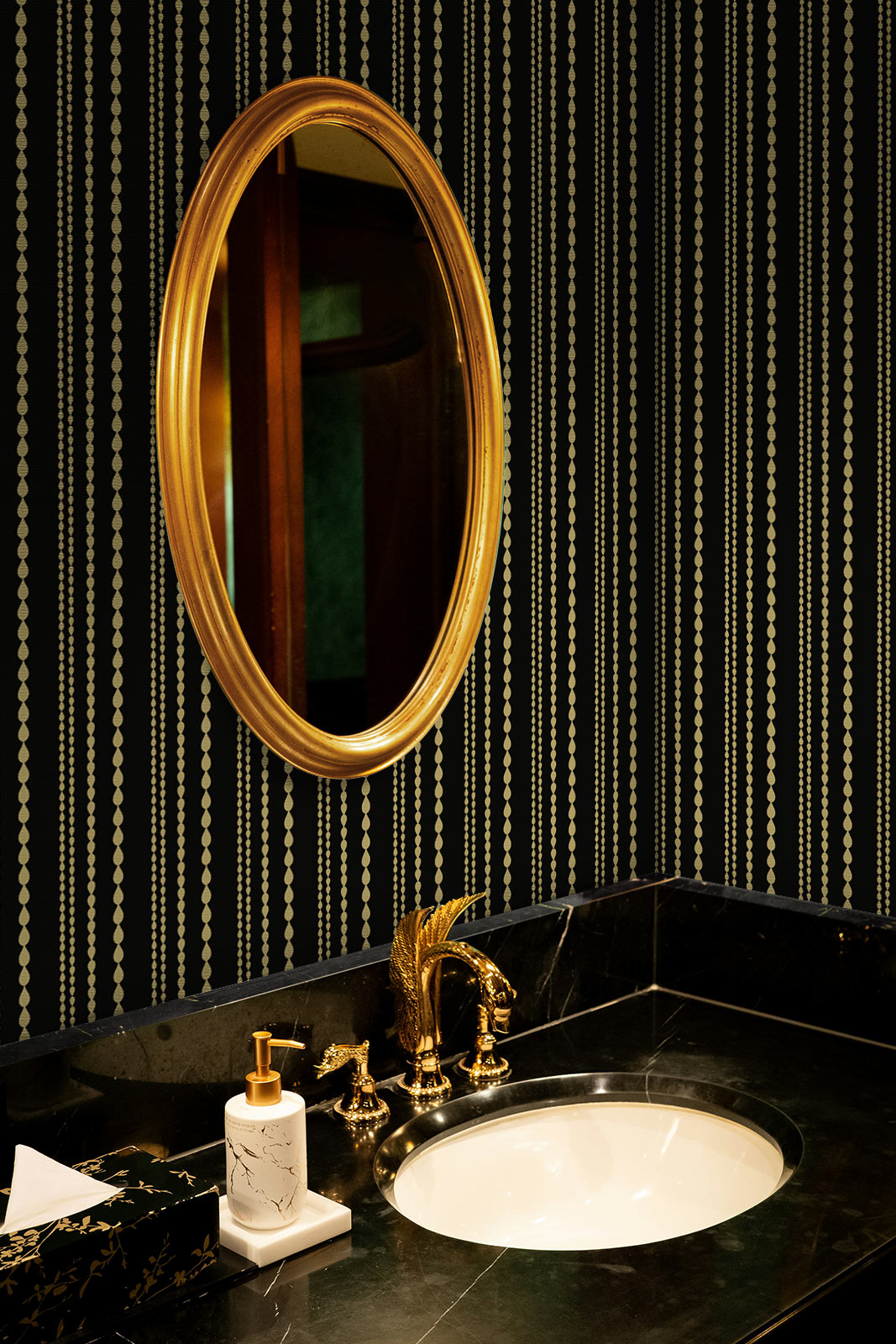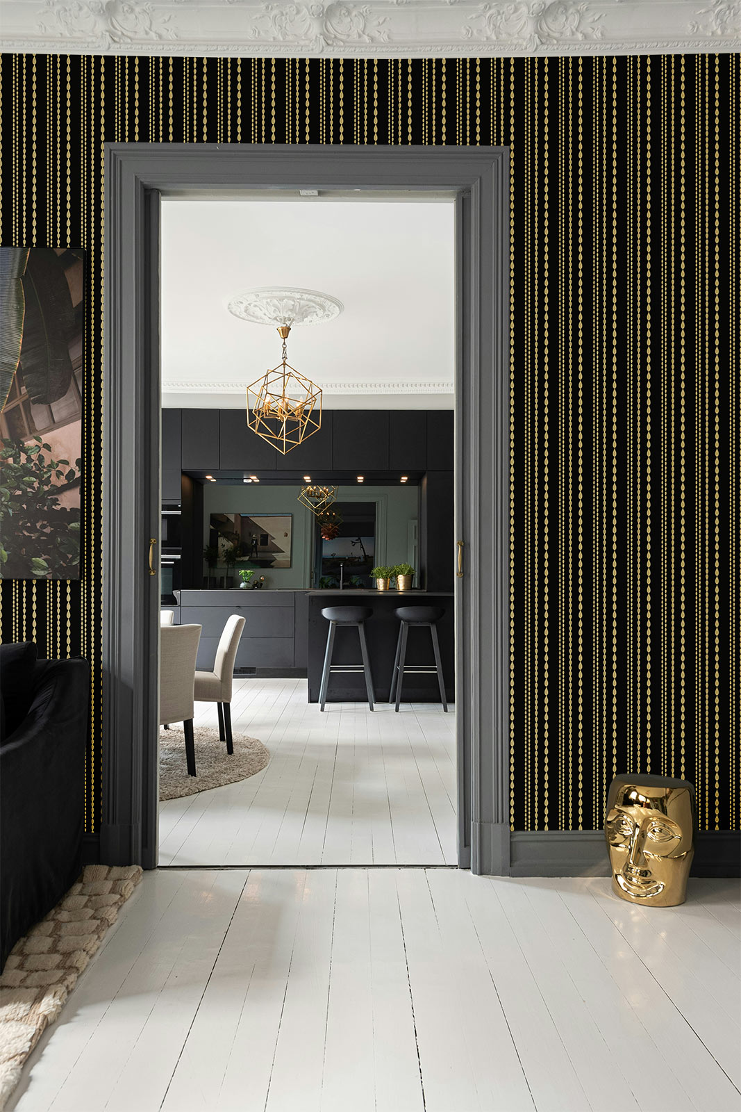 This black striped wallpaper creates instant atmosphere. The dark backdrop adds depth and intimacy, while the golden detail catches the light, bringing a subtle sense of luxury. Whether you pair it with marble and brass in a bathroom, or let it frame a dining room feature wall, the result is pure sophistication.