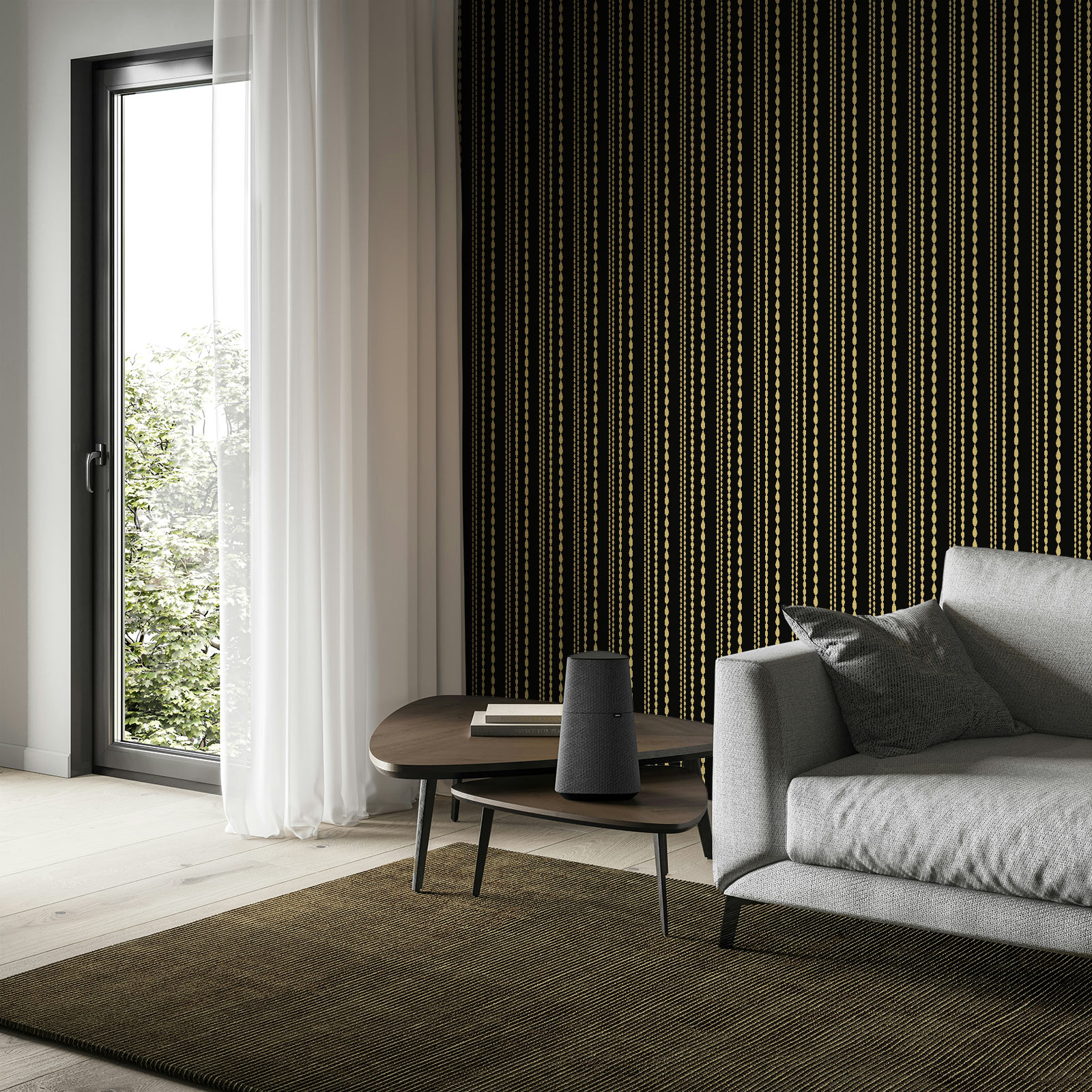 Stripes never go out of style — but they’ve rarely looked this bold. Coquette Stripes in black takes the classic vertical line and turns it into a shimmering chain of golden beads. The effect is striking yet elegant, a design that feels just as at home in a powder room as it does on a dramatic living room wall.